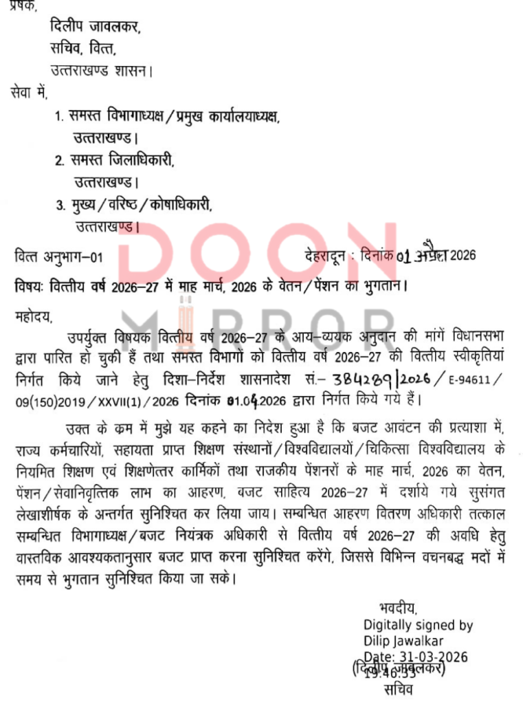 उत्तराखंड सरकार ने कर्मचारियों और पेंशनरों के लिए बड़ी राहत भरी खबर दी है। अब वित्तीय वर्ष 2026-27 में मार्च माह के वेतन और पेंशन के भुगतान के लिए बजट जारी होने का इंतजार नहीं करना पड़ेगा। वित्त विभाग की ओर से जारी आदेश में स्पष्ट निर्देश दिए गए हैं।