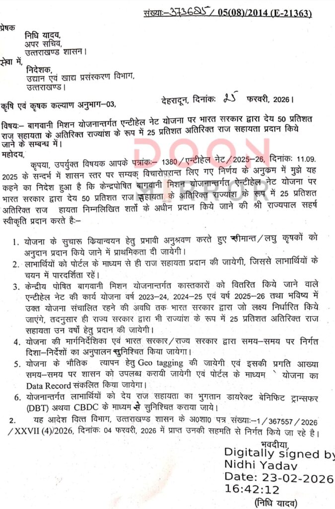 राज्य सरकार ने बागवानी मिशन के तहत एंटीहेल नेट योजना में किसानों को बड़ी राहत दी है। भारत सरकार द्वारा देय 50 प्रतिशत अनुदान के अतिरिक्त अब राज्यांश के रूप में 25 प्रतिशत अतिरिक्त राज सहायता भी प्रदान की जाएगी। इस संबंध में शासन स्तर से आदेश जारी कर दिया गया है।