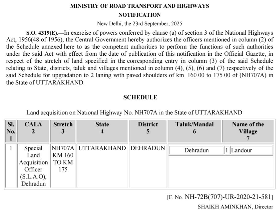 पहाड़ के सीमावर्ती ग्रामीण इलाकों को यातायात सुविधा से जोड़ने वाले त्यूणी-चकराता-मसूरी-बाटाघाट एनएच 707-A के 15 किलोमीटर के भाग को डबल लेन बनाने की कवायद शुरू हो गई। जिस क्रम में अब NHAI ने आदेश जारी कर SLAO देहरादून को जमीन अधिग्रहण के सक्षम अधिकारी नामित किया है।