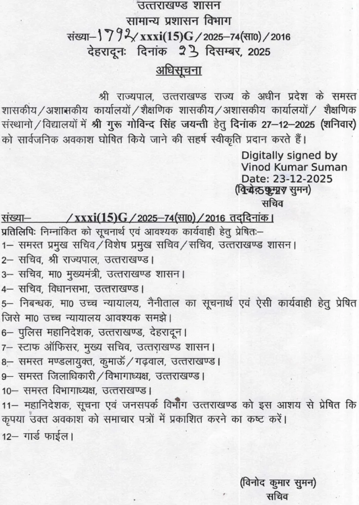 उत्तराखंड सरकार ने 27 दिसम्बर को गुरु गोविंद सिंह जयंती के उपलक्ष्य में घोषित किया अवकाश, बंद रहेंगे समस्त विद्यालय व सरकारी कार्यालय !!