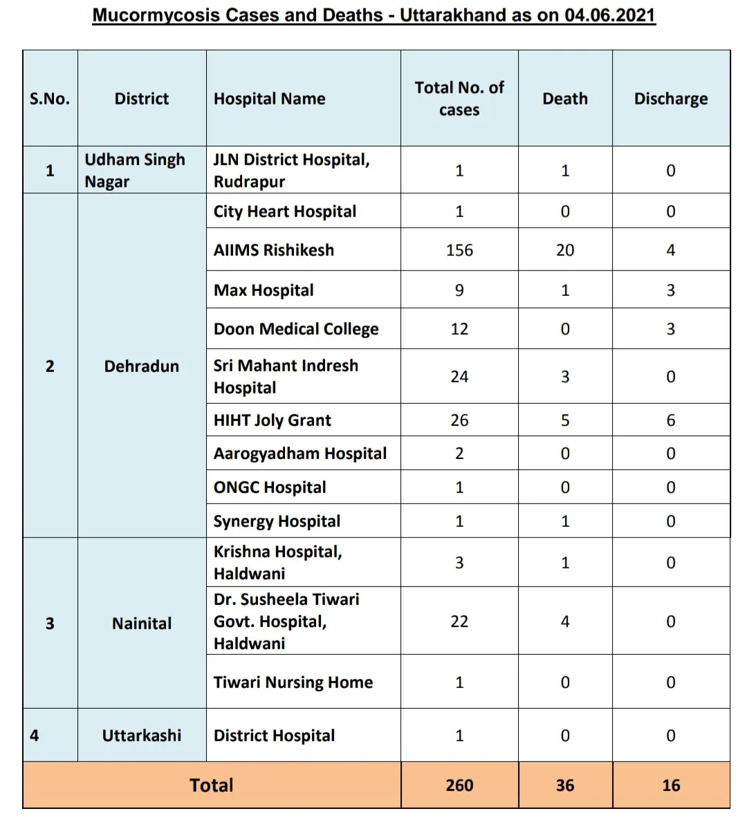 अभी तक उत्तराखंड में ब्लैक फंगस के कुल 260 मामले सामने आए हैं, जिसमे से 232 मामले केवल देहरादून से सामने आये हैं। उत्तराखंड में अभी तक 36 लोगों की मृत्यु ब्लैक फंगस से हो चुकी है ।